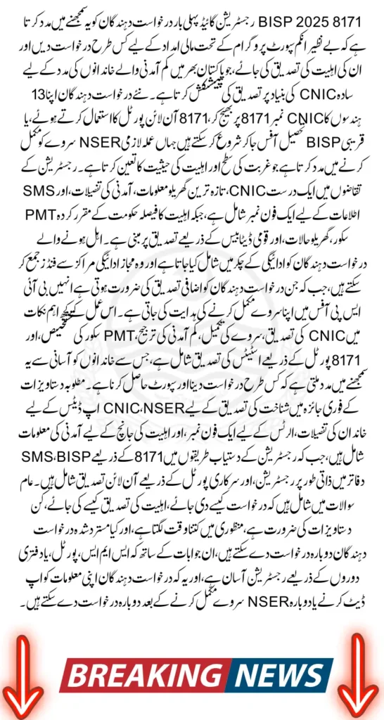 Applicants can also use the 8171 online portal, which allows them to enter their CNIC, confirm eligibility, and check whether their registration is complete. The portal provides quick verification, especially for individuals who have already completed the NSER survey but are unsure about their status. After approval, applicants are added to the payment cycle and can collect assistance from BISP partner banks or designated payment centres.