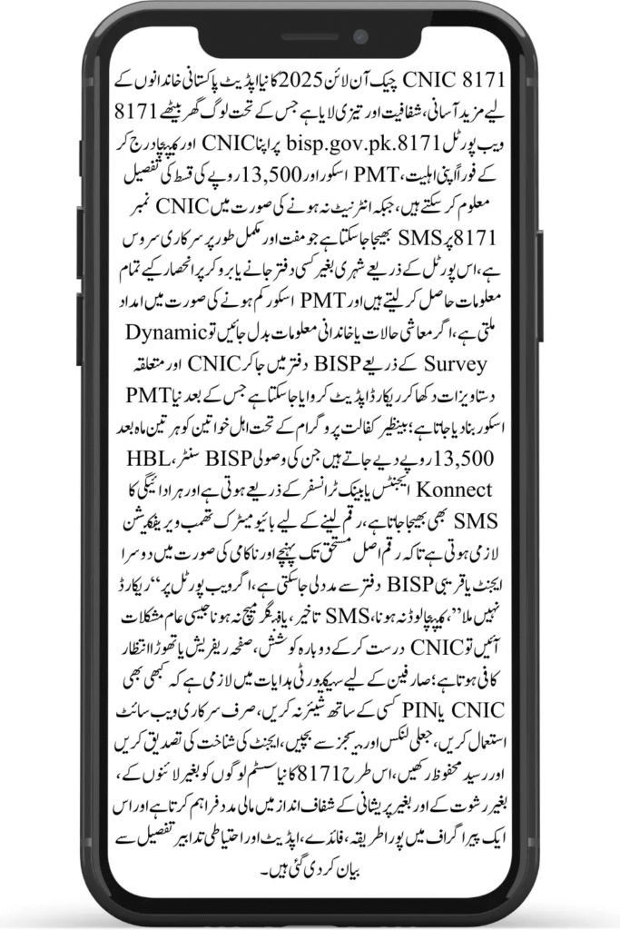 The 8171 CNIC check online 2025 update marks a significant step toward digital transparency and efficiency in Pakistan. Online eligibility checks, dynamic surveys, and thumb-verified payments allow citizens to securely receive their Rs 13,500 instalments without middlemen or delays.