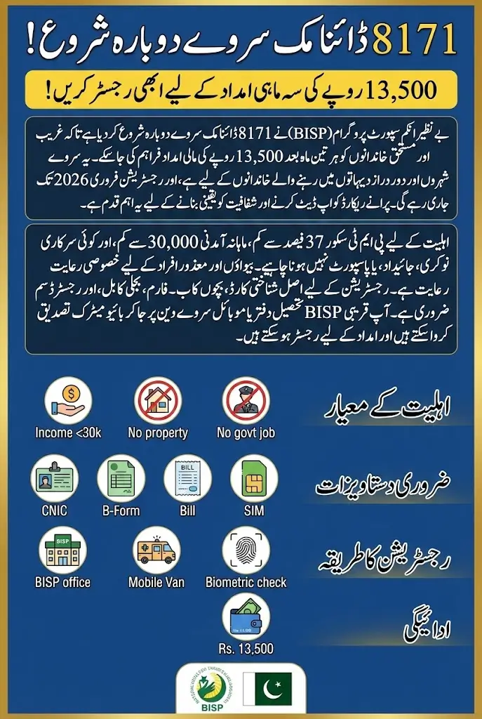 The 8171 Dynamic Survey has been officially restarted by the Benazir Income Support Program. This survey allows eligible families to register for quarterly financial help of Rs. 13,500. The program targets low-income households across Pakistan. It focuses on families that need consistent support to meet basic needs.