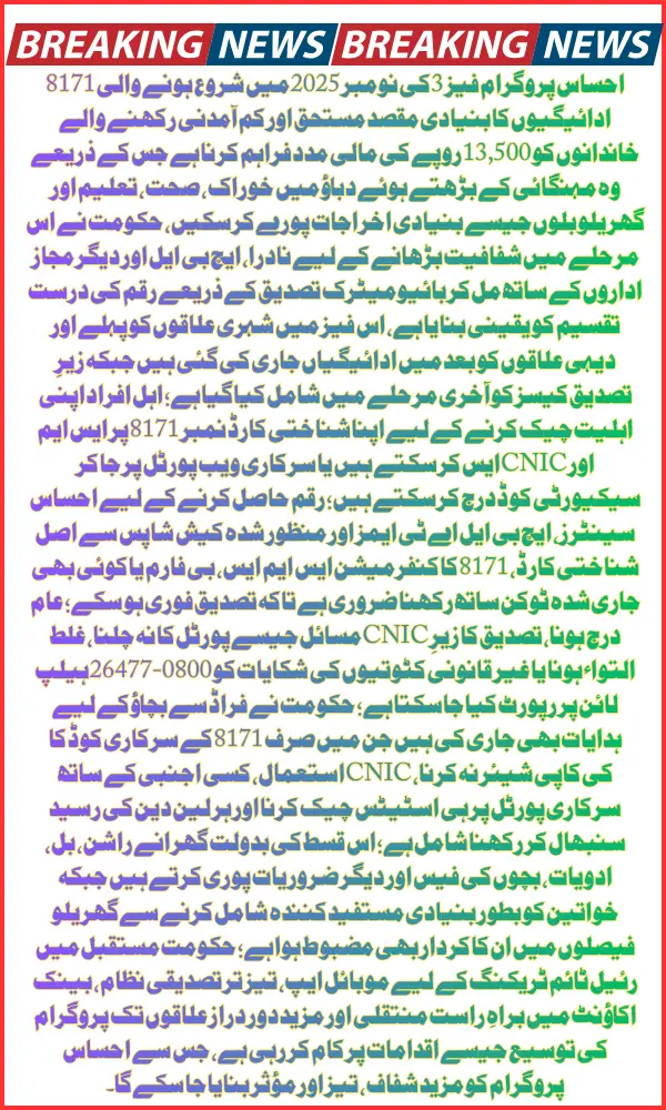 The 8171 Ehsaas Program Phase 3 Payments have officially begun in November 2025, offering Rs. 13,500 to eligible low-income families across Pakistan. This installment is designed to ease financial pressure caused by rising inflation, helping households manage essential needs such as groceries, healthcare, education, and utility expenses. With a digitized system and stricter transparency measures, Phase 3 aims to deliver relief more efficiently than previous phases.