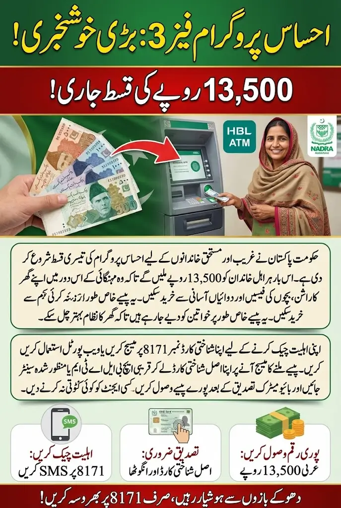 The 8171 Ehsaas Program Phase 3 Payments have officially begun, offering Rs. 13,500 to eligible low-income families across Pakistan. This installment is designed to ease financial pressure caused by rising inflation, helping households manage essential needs such as groceries, healthcare, education, and utility expenses. With a digitized system and stricter transparency measures, Phase 3 aims to deliver relief more efficiently than previous phases.