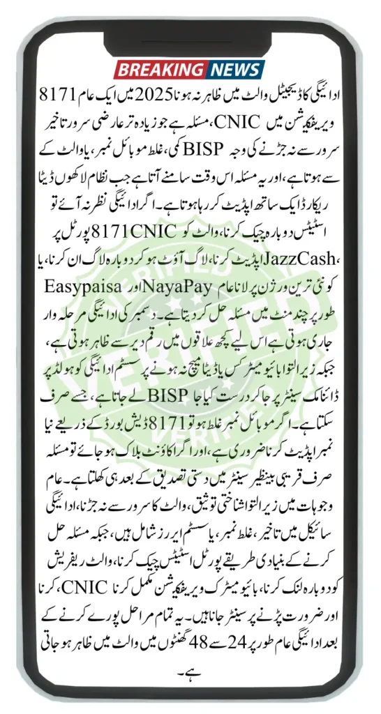 Most cases of 8171 payment not showing are caused by temporary sync delays or incomplete verification. Following the steps above normally restores visibility within minutes. Keeping your mobile number and CNIC updated prevents future delays and ensures smooth payments.