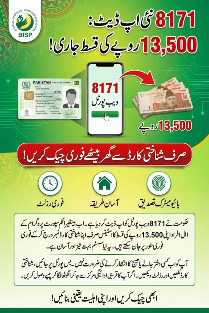 The upgraded 8171 Web Portal 2026 provides a fast, reliable, and user-friendly system for checking BISP payments. Beneficiaries can verify their CNIC instantly and take appropriate steps for payment collection. This system ensures transparency, reduces delays, and guarantees that low-income families receive timely support. Visit the portal today and confirm your eligibility to secure your Rs. 13,500 payment.