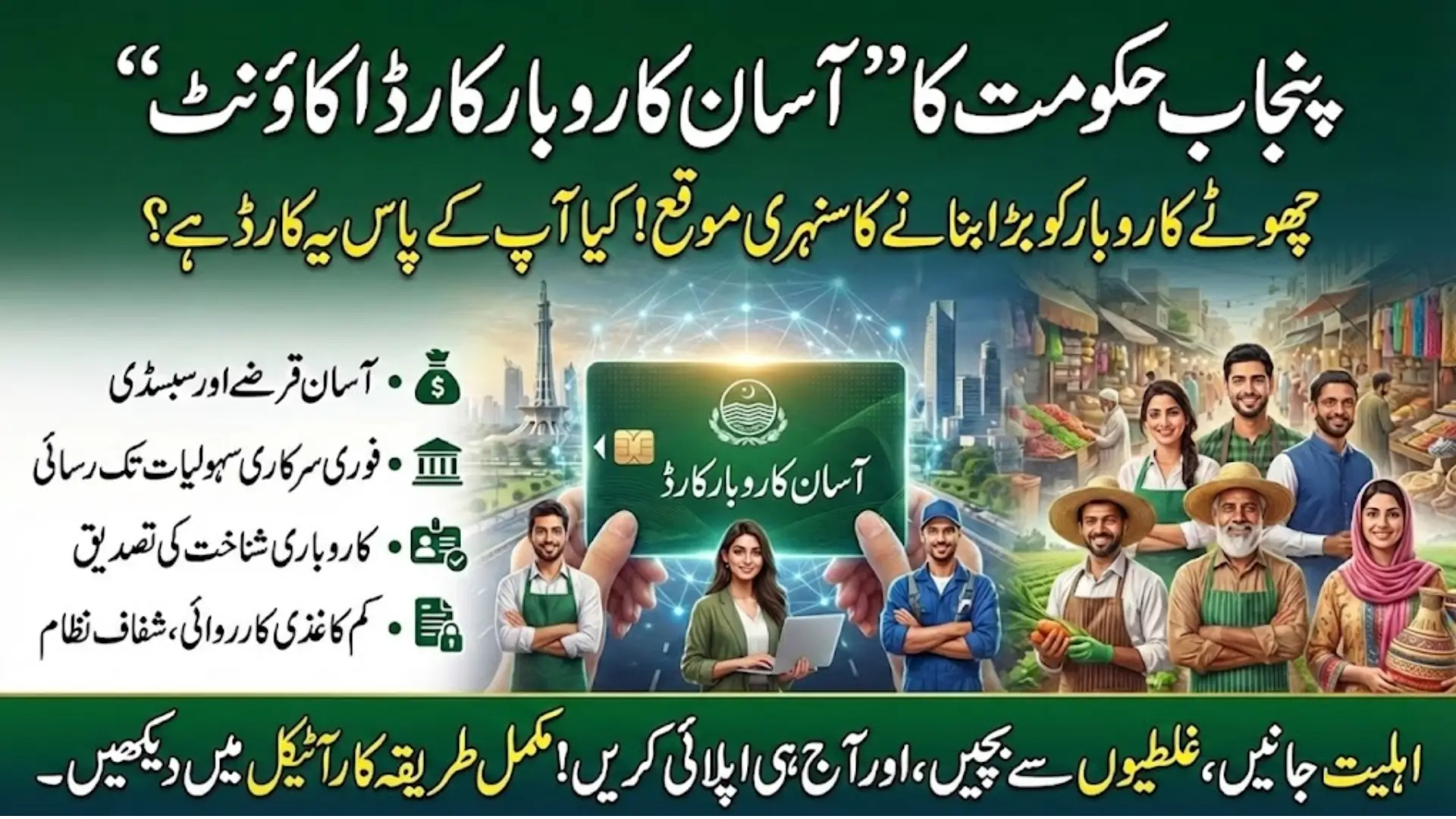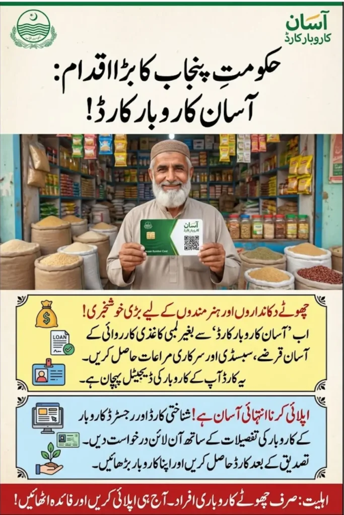 The Asan Karobar Card account is a Punjab Government initiative to help small business owners and micro-entrepreneurs. It provides financial support, easy access to government services, and verification of business identity. This account makes it easier to get loans, subsidies, and approval for schemes without long paperwork. The card is useful for traders, shop owners, freelancers, and small workshops.