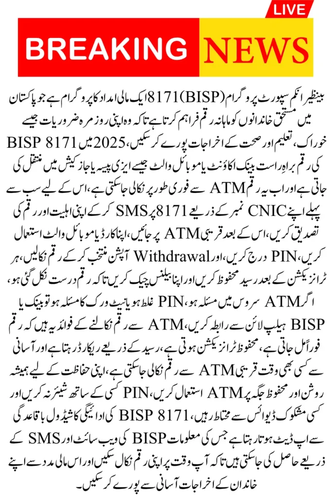 The BISP 8171 ATM Withdrawal continues to provide crucial financial assistance to eligible families across Pakistan. In 2025, thousands of beneficiaries are relying on BISP 8171 payments to meet their daily needs. With the advancement of banking services and ATM facilities, beneficiaries can now withdraw their payments instantly using ATMs, making the process simpler and faster than ever. This guide will explain everything you need to know about BISP 8171 ATM withdrawal in 2025, from checking your eligibility to the step-by-step withdrawal process.