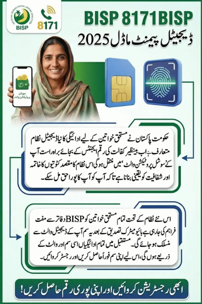 The BISP 8171 Digital Payment Model is a redesigned payment system that moves beneficiaries from traditional cash-based channels to a secure digital platform. This system ensures that all future BISP payments, especially those under the Benazir Kafalat Program, are transferred directly into a digital wallet created for each woman. The goal is to eliminate unauthorized deductions, long queues, and dependency on agents.