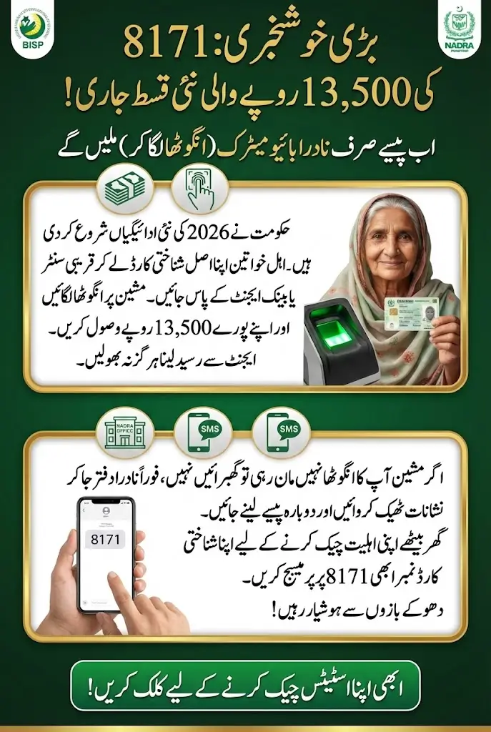 TheBenazir Income Support Programme has officially started the BISP 8171 NADRA Biometric Payment process for 2026, allowing registered families to receive their payments safely and transparently. This system ensures that financial assistance reaches the rightful beneficiaries through a secure biometric verification process. In this complete guide, you’ll learn everything about the BISP 8171 NADRA Biometric Payment, including eligibility, verification methods, payment locations, and troubleshooting tips.