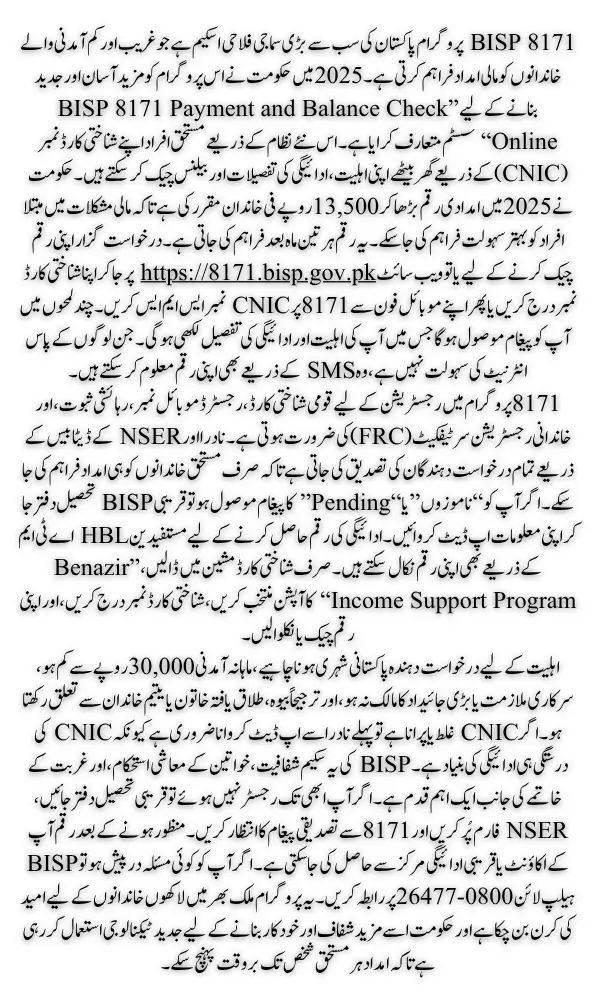 The BISP 8171 Payment and Balance Status of Pakistan’s most significant welfare initiatives, which provides financial assistance to low-income families across the country. The government has continuously updated and improved this program to ensure that deserving citizens can receive their financial aid easily. In 2025, a major advancement is the introduction of the BISP 8171 Payment and Balance Check Online system, which allows beneficiaries to check their eligibility, payment status, and balance using their CNIC number.