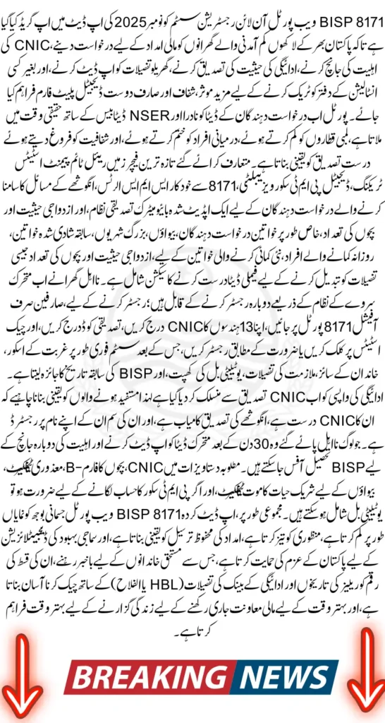 The BISP 8171 Web Portal Online Registration (November 2025 Update) is a major step toward making financial assistance easy, accessible, and transparent for millions of Pakistani families. With enhanced CNIC verification, real-time eligibility checks, updated payment tracking, and an improved registration system, the portal ensures that every deserving household receives timely support. By shifting services online, BISP has made the welfare process more efficient and user-friendly, especially for women and low-income families. Beneficiaries are encouraged to regularly check their CNIC status, update their household data, and stay connected to the portal for all upcoming announcements and installment releases.