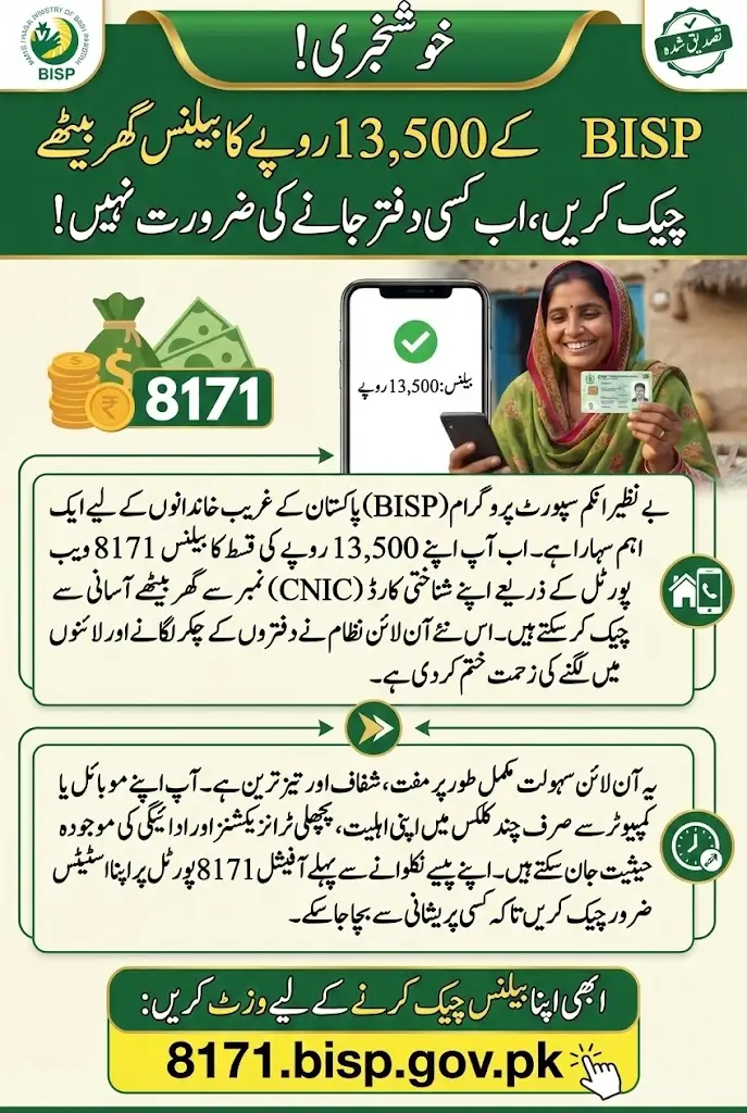 By using the 8171 portal, eligible citizens can check their balance, confirm registration, and stay informed about new disbursements. Make sure your CNIC is registered, your data is accurate, and your eligibility is up to date so you never miss your Rs13,500 BISP payment.