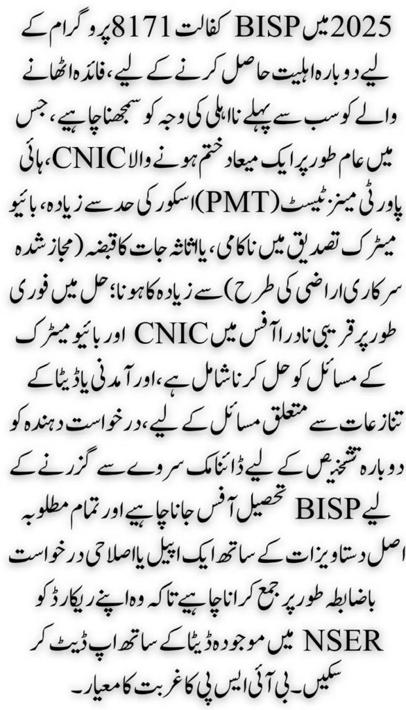 - Once your NADRA profile is updated, BISP may re-verify your case based on the new data.