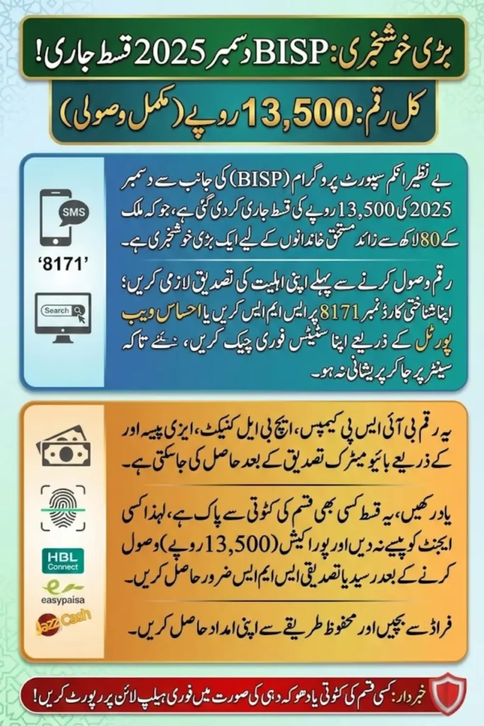 The BISP Rs 13,500 installment for December 2025 is part of the Benazir Kafalat Program 8171, a flagship initiative under the Benazir Income Support Program (BISP). This program provides essential financial assistance to low-income households across Pakistan, helping families manage basic needs such as food, education, healthcare, and household bills. The January 2026 installment has officially started reaching beneficiaries, and many families are eager to learn how to collect their payments safely.