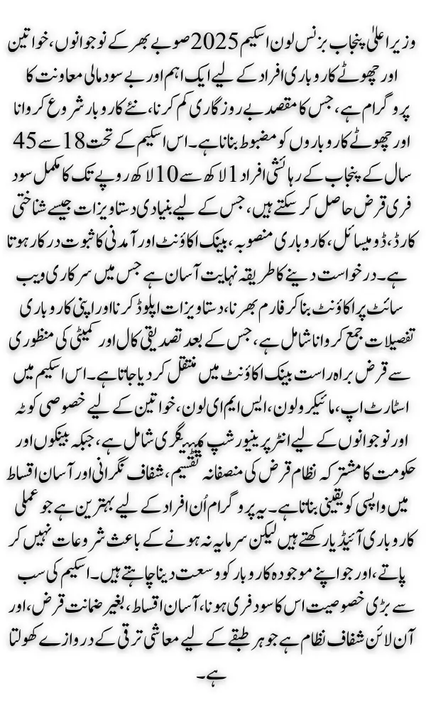 The CM Punjab Business Loan Scheme 2025 provides interest-free loans ranging from small start-up amounts to larger business development funds. The program is structured to provide financial support to youth, women, and low-income families who want to build sustainable businesses.