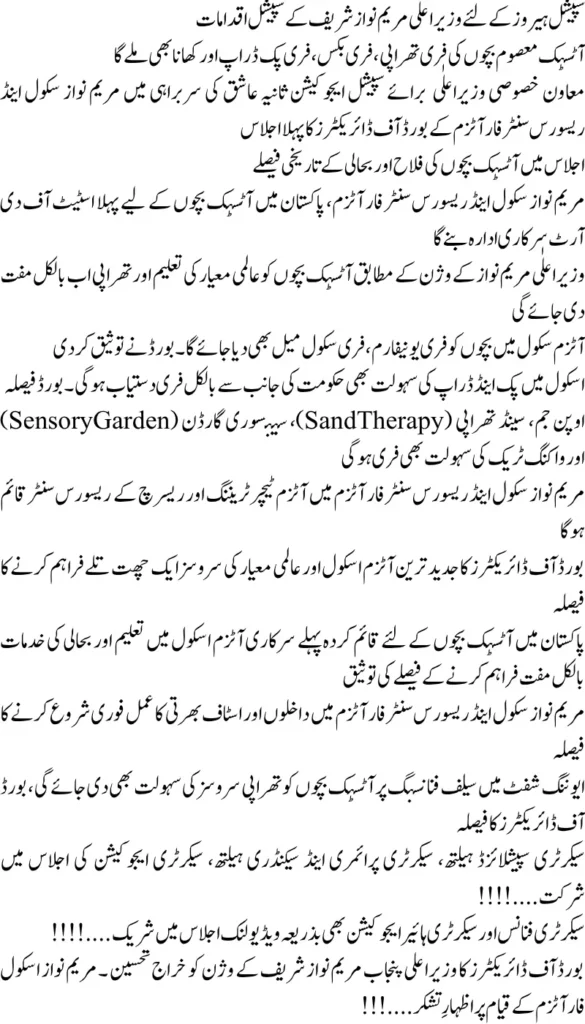 During the meeting, several groundbreaking measures were approved to ensure that every autistic child receives world-class support. The board also appreciated the leadership of Maryam Nawaz Sharif for her dedication to improving the lives of special children.