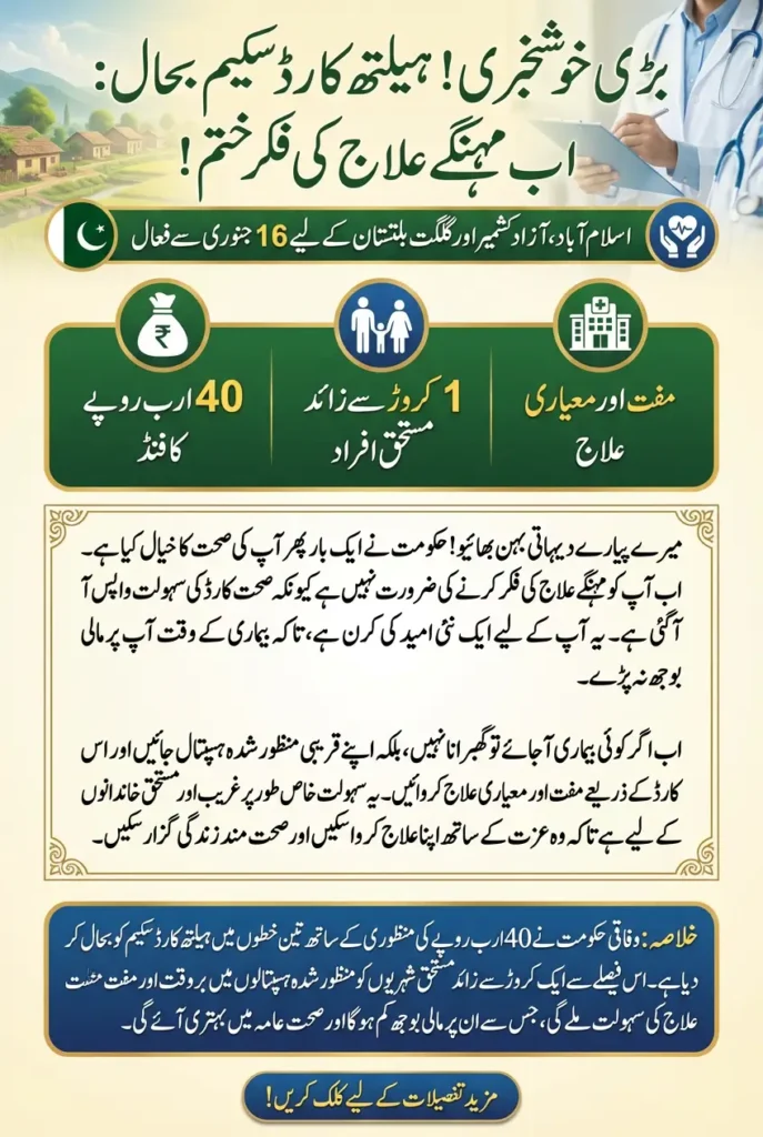 The decision to restore the health card scheme for Islamabad, Azad Kashmir, and Gilgit-Baltistan is a major relief for millions of citizens. With activation starting from January 16 and a Rs 40 billion allocation approved, the scheme promises improved access to healthcare and financial protection for deserving families. This move is expected to strengthen public health and bring long-term benefits to the healthcare system.