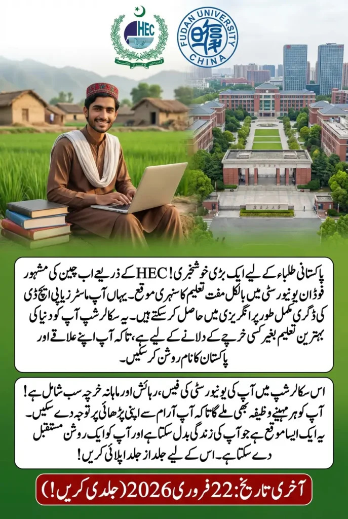 HEC Fudan University Scholarship 2026: The Higher Education Commission has announced the HEC Fudan University Scholarship 2026 for Pakistani students under the Chinese Government’s International Elite Pioneer Program. This opportunity allows talented students to pursue Master’s and PhD degrees at Fudan University, one of China’s most respected and globally ranked institutions, with all academic instruction delivered entirely in English.