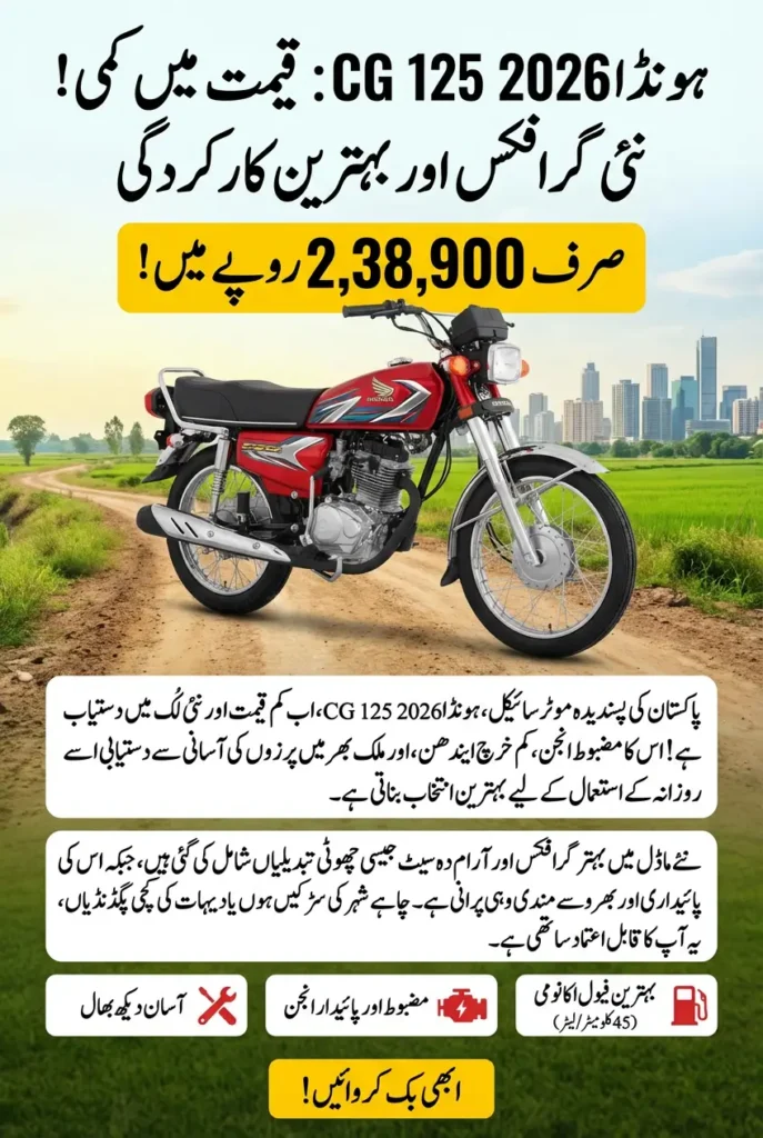 Honda CG 125: The Honda CG 125 2026 model is now available in Pakistan at a reduced price of Rs 238,900. While the mechanical features remain largely unchanged from the 2025 model, the 2026 version includes minor improvements in its graphics and overall appearance. The CG 125 has maintained its position as one of Pakistan’s most popular motorcycles due to its strong engine, reliable performance, and durability. Riders across the country continue to prefer this model for both city commuting and long-distance travel.