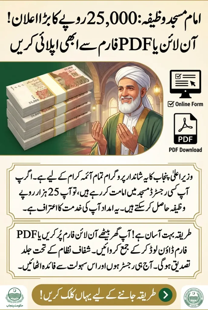 Imam Masjid Wazifa 25000 apply online program: The Imam Masjid Wazifa 25000 apply online program has been introduced to provide financial assistance to mosque Imams under the CM Punjab initiative. This program aims to support Imams who serve communities by offering a fixed wazifa through a transparent registration process. Both online application and PDF-based registration options have been provided to make the process easier and accessible.