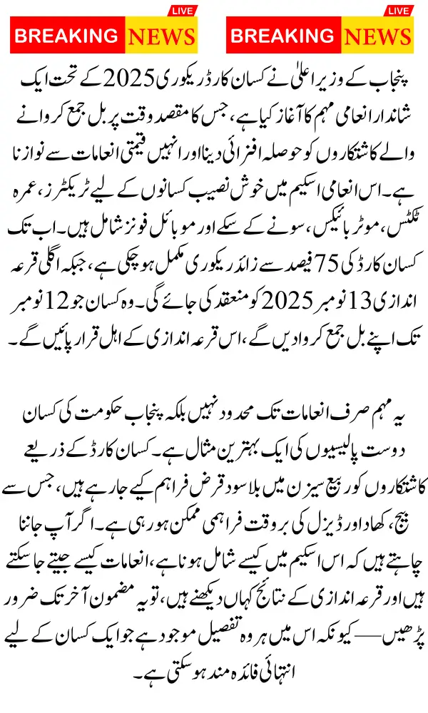 Punjab Kisan Card Recovery 2025 is a practical incentive system that turns timely repayment into tangible benefits. The scheme combines interest-free support, fast payment cycles, and reward draws to motivate farmers and keep credit circulating in the agricultural economy. If you hold a Kisan Card, remember these three steps for the current draw: submit your bill before 12 November 2025, keep your payment receipt safe, and check official channels for the winners on 13 November 2025. Participate responsibly; the program is designed to help you and the wider farming community.