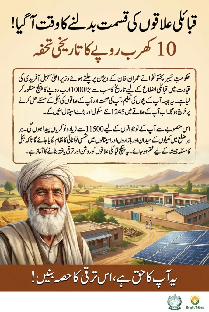 KP tribal districts development package: The Khyber Pakhtunkhwa government has approved a historic Rs 1,000 billion development package for the merged tribal districts under the Bright Tribes, Bright Pakistan vision. This large-scale initiative reflects the long-term development thinking inspired by Imran Khan’s vision and implemented under the leadership of Chief Minister Khyber Pakhtunkhwa Muhammad Sohail Khan Afridi. The package aims to address decades of underdevelopment by improving essential public services and infrastructure.