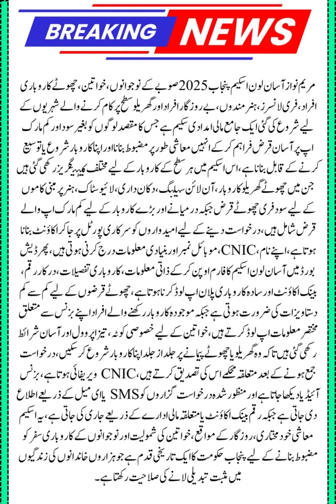 The Maryam Nawaz Asaan Loan Scheme, Punjab, is a transformative initiative. That aims to empower individuals by giving them financial independence and the opportunity to build stable businesses. With its simple online application process, minimal documentation. Transparent verification and an inclusive approach, the scheme stands as a major step toward economic stability and empowerment across Punjab.