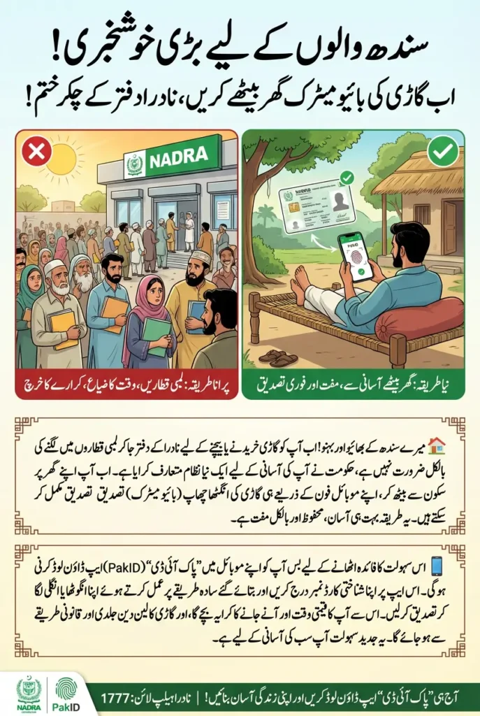 NADRA Vehicle Biometric Verification Sindh: The National Database and Registration Authority (NADRA) has introduced a significant improvement in vehicle registration procedures in Sindh. Citizens can now complete NADRA vehicle biometric verification in Sindh from the comfort of their homes using the PakID mobile app. This new facility eliminates the need to visit NADRA offices, making vehicle buying and selling processes faster, easier, and more convenient for residents.