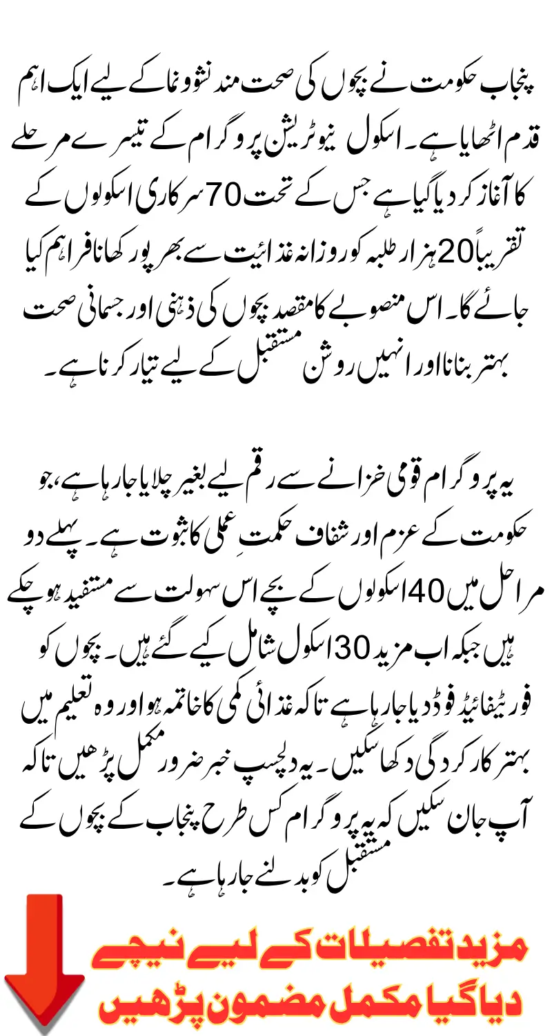 According to Special Assistant to the Chief Minister, Salma Butt, the success of any nation depends on the mental and physical growth of its children. She emphasized that the government is determined to further expand this program so that every child can benefit from nutritious food during their school years.